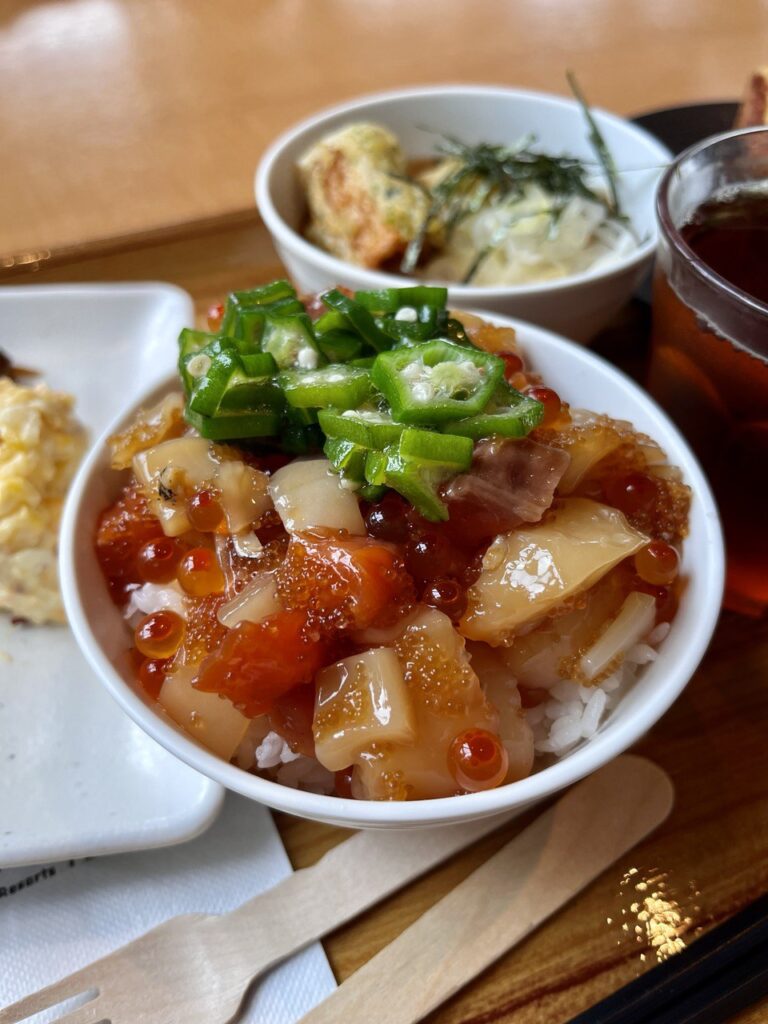 メインはなんといっても海鮮です。サーモン、イカ、いくら、とびっこがたっぷり!最後に、私はオクラをのせました。